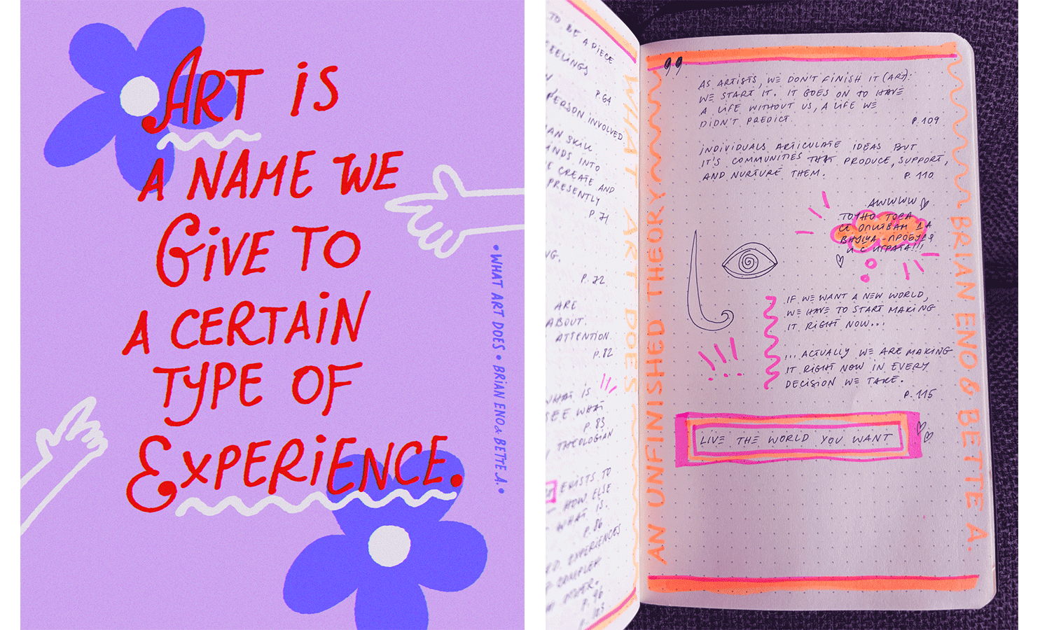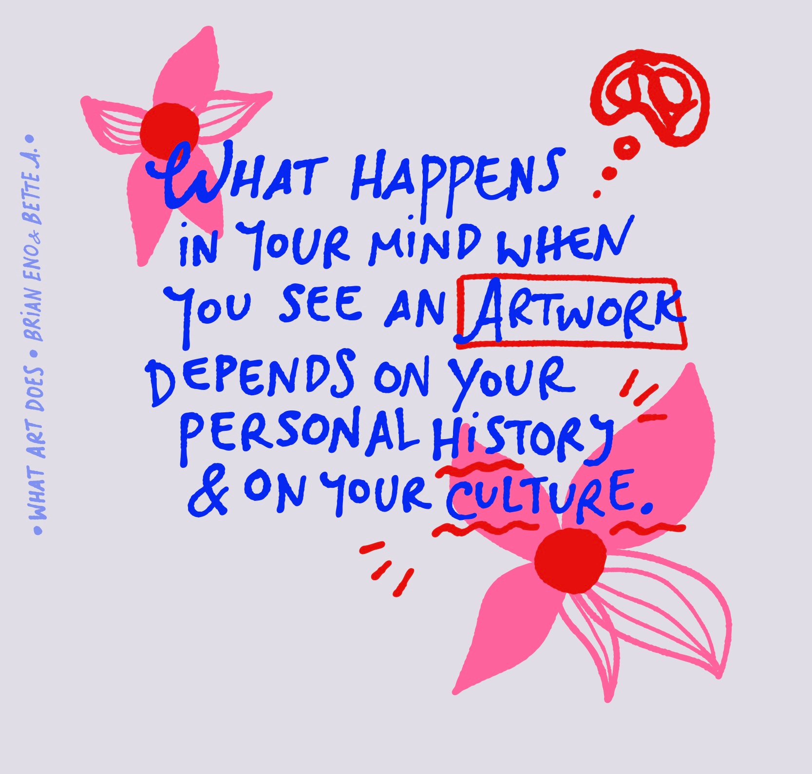 💭 <on What Art Does: an Unfinished Theory by Brian Eno & Bette A./> I found this cute little-big book in the Netherlands last Summer, but it has been leaning on the shelf since then. Finally managed to have a “research day” (meaning a day without client/project work) and dedicated it to me researching something and writing about it. The book is a bit over 100 pages, but with its small format, it was easy to read in a little time (Eno said he wanted to make it so that people can read it for an hour and a half; and then, probably, to read it again). And what an inspiring hour and a half it was!